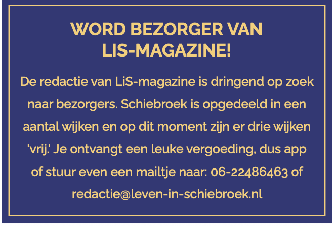 De redactie van LiS-magazine is op zoek naar bezorgers voor een drietal wijken in Schiebroek. LiS-magazine verschijnt 6 keer per jaar en voor bezorgers is er een vergoeding beschikbaar. Hebt u zin en tijd om LiS-magazine rond te brengen, neem dan alstublieft even contact met ons op.