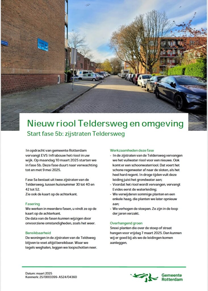 In opdracht van gemeente Rotterdamvervangt EVS Infrabouw het riool in Schiebroek. Op maandag 10 maart 2025 starten we in fase 5b. Deze fase duurt naar verwachting tot en met 9 mei 2025.